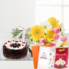 15 Pink Roses N White & Yellow Gerbra Bunch N Hlaf Kg. Black Forest Cake With 1 Kg. Rasgulla With 1 ..